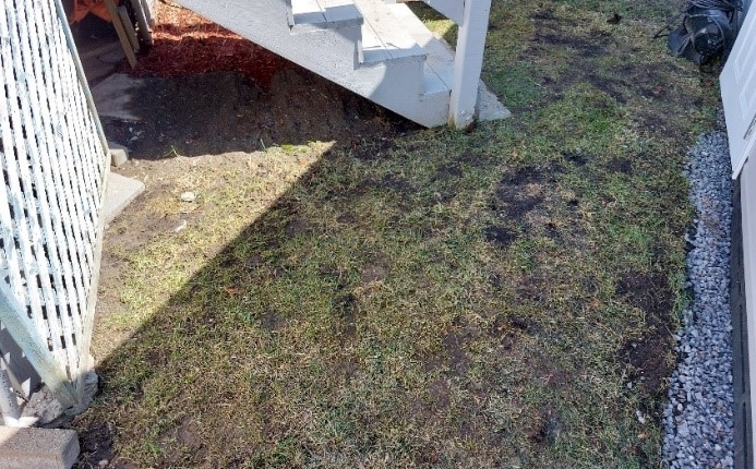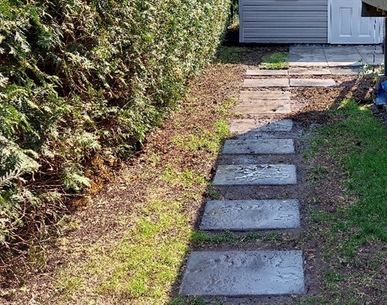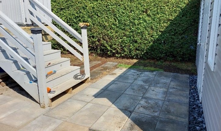 Projet : Installation de dalle de béton pour la construction d’une allée piétonnière. Relocalisation de l’escalier et réalisation d’une surface de dalle de béton de 120 pieds carrés sur une base de paver base avec finition des joints au sable polymère.